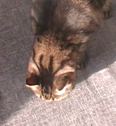 Das ist Crazy, eine Katze, grau-gelb, getigert etwa 2.5 Jahre alt. Ebenfalls Familie der Europäischen Hauskatzen oder Europäischen Kurzhaarkatzen.